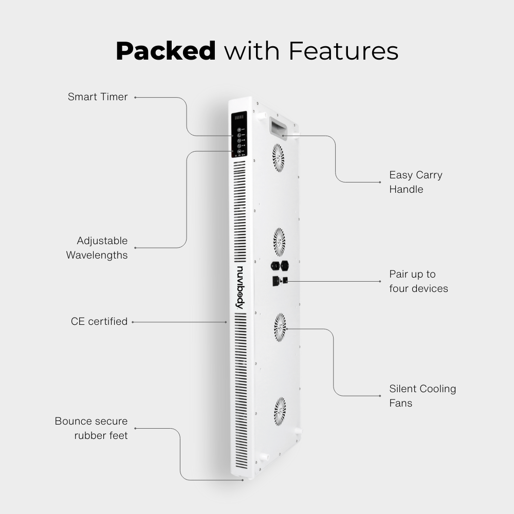 Dankzij de ingebouwde timer en stille koeling is de lamp eenvoudig en veilig in gebruik. Bovendien kun je meerdere lampen koppelen tot een volledig systeem voor full-body therapie – ideaal voor wie het maximale uit roodlichttherapie wil halen.